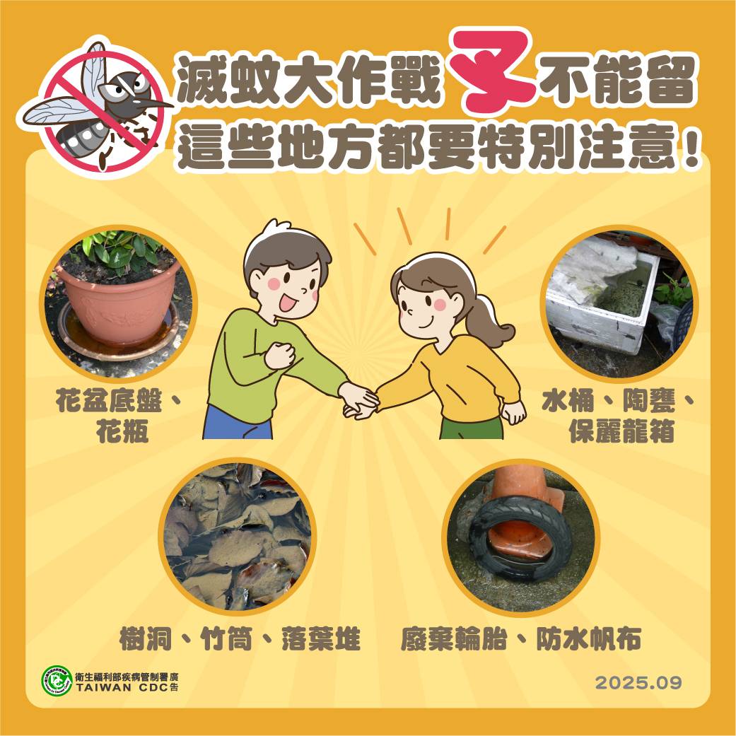 11409滅蚊大作戰(1) 滅蚊大作戰,孓不妥協! 花盆底盤、花瓶、水桶、陶甕、保麗龍箱、樹洞、竹筒、落葉堆、廢棄輪胎、防水帆布..., 這些容易被忽略的積水,都是病媒蚊最愛的孑孓產房! 落實防蚊四招「巡、倒、清、刷」,小動作=大保護,一起行動遠離登革熱威脅。