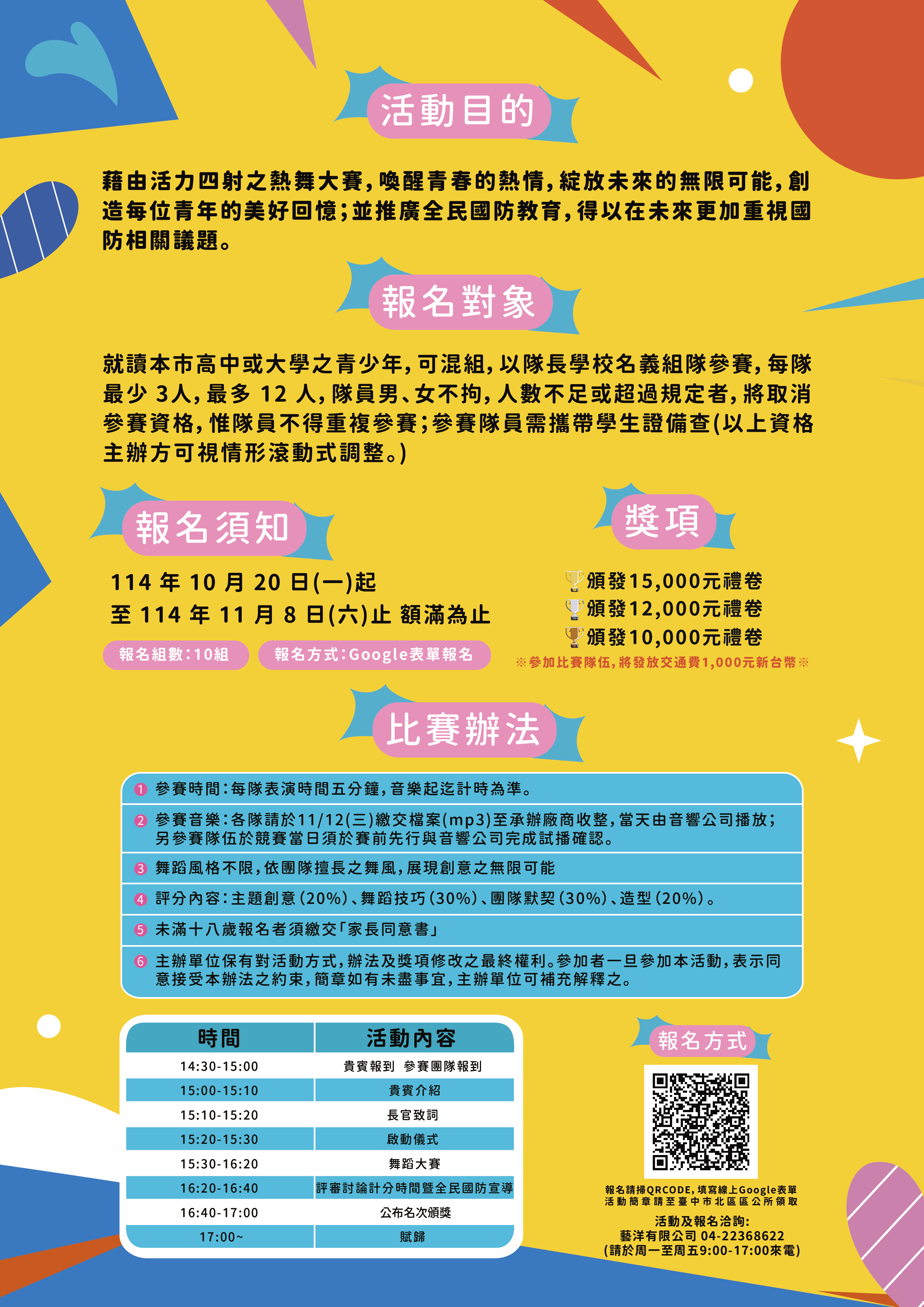 為鼓勵青少年投入正當休閒運動活動,透過熱舞調劑身心與培養運動精神,並藉機向大眾宣導全民國防之重要,中市北區區公所特別舉辦「」,活動訂於114年11月16日(星期日)下午2時30分至5時於臺中市一中商圈水利大樓前廣場(臺中市北區尊賢街7號)舉辦。