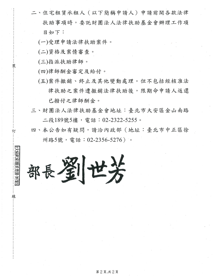 內政部為健全住宅租賃關係,業於114年12月30日公告委託財團法人法律扶助基金會辦理115年度住宅租賃糾紛處理及諮詢業務。