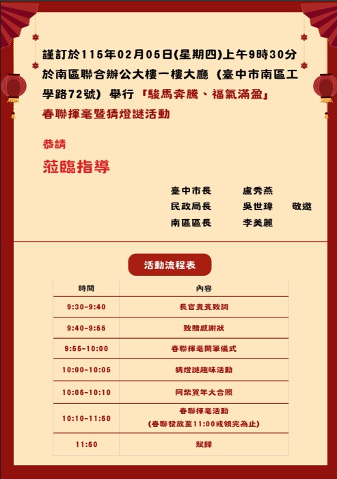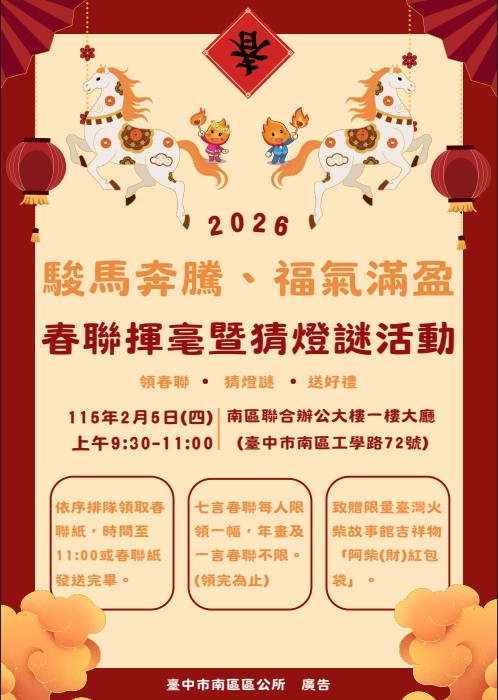 中市南區區公所訂於115年2月5日(星期四)上午9時30分,假該區聯合辦公大樓1樓大廳舉辦「2026駿馬奔騰、福氣滿盈」春聯揮毫暨猜燈謎活動,邀請9位書法名家現場揮毫,民眾可免費排隊領取春聯。領取規則如下
