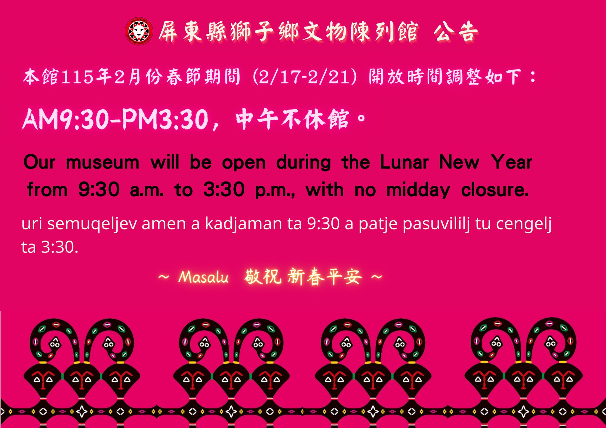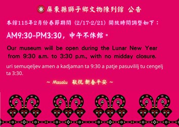 屏東縣獅子鄉公所刻正辦理「Ki cacepeliw 從海那邊.歡迎回家—瑞典國家世界文化博物館典藏排灣族百年文物重返獅子鄉特展」,特展係與瑞典國家世界文化博物館及國立臺灣博物館合作,借展 48 件典藏於瑞典國家世界文化博物館之排灣族珍貴文物返臺展示。透過文物返鄉展出,重新連結族群記憶與文化脈絡,深具歷史意義與文化價值,亦為地方文化館推動國際文物交流與文化公共服務之重要成果。
